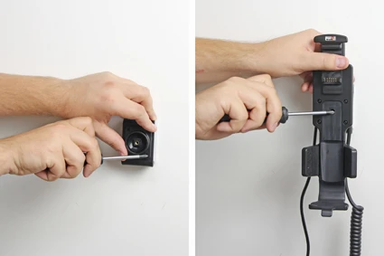 Place the attaching plate onto the desired position. Screw the attaching plate into place with the enclosed screws. Place the holder over the attaching plate so the screw fits in the hole in the tilt swivel. Tighten the screw firm at first, then loosen it a bit so the holder is firmly in place, but still can be adjusted.