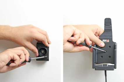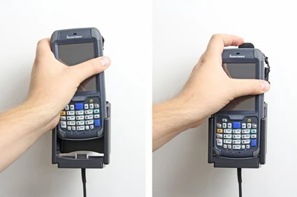 To place the device in the holder: Place the bottom part of the device into the holder. Press the top of the device forward and in the same time slide the device downward into place in the holder. To remove the device from the holder: Press the upper part of the holder forward. When the device is set free, lift it upward out of the holder.