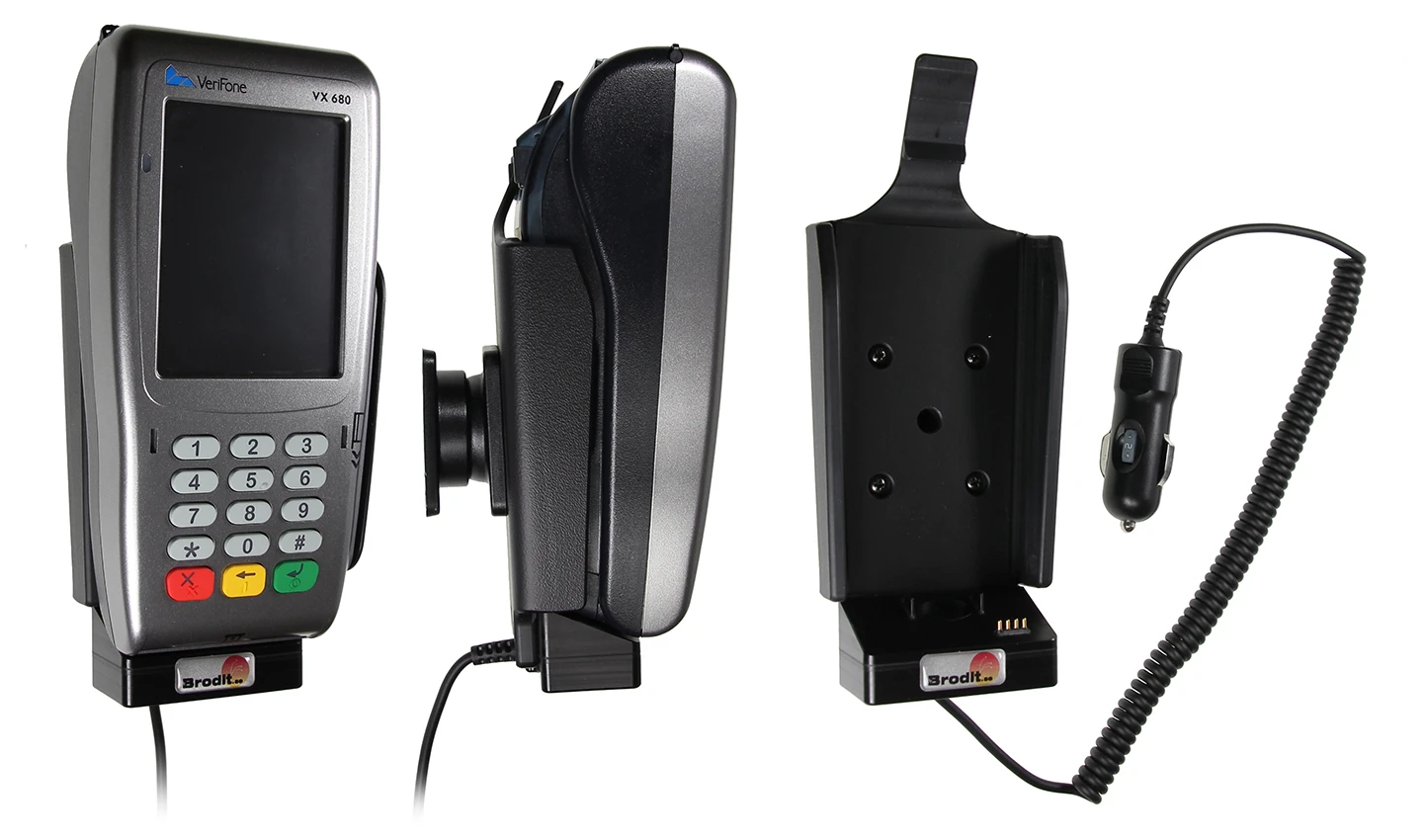 The active holder charges your battery when it is in the holder. The charging device connects to the payment terminal automatically when you put the terminal in the holder. The holder is attached onto a tilt swivel and can be adjusted in order to avoid light reflection. Connects to the vehicle’s cigarette lighter socket, 12/24 Volt. Attach onto ProClip Mounting Platform.