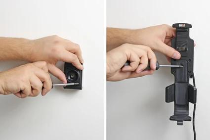 Place the attaching plate onto the desired position. Screw the attaching plate into place with the enclosed screws. Place the holder over the attaching plate so the screw fits in the hole in the tilt swivel. Tighten the screw firm at first, then loosen it a bit so the holder is firmly in place, but still can be adjusted.