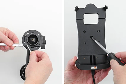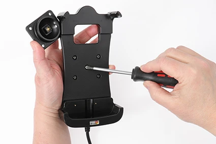 The holder is equipped with a tilt swivel so you can easily adjust the angle for better viewing, or switch between portrait and landscape mode. Tilts 17° and swivels 360°. Mounting plate 42x50 mm with 4 mm AMPS-holes. Made of high grade black ABS/Acetal plastic. Made in Sweden. Attach onto a Pedestal Mount or an ProClip mounting platform.