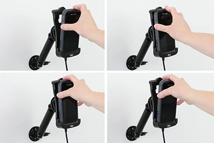 To place the device in the holder: Place the lower part of the device in the bottom of the holder. Flip/Press the top of the device forward into place in the holder. To remove the device from the holder: Place your index finger on the upper part of the holder and push at the same time as you pull the upper part of the device out from the holder. When the device is set free, lift it upward out of the holder.
