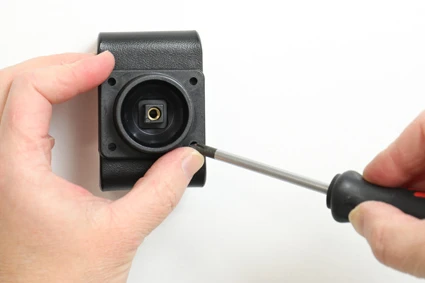 Place the holder over the attaching plate so the screw fits in the hole in the tilt swivel. Tighten the screw until the holder is firmly in place, but still can be adjusted.
