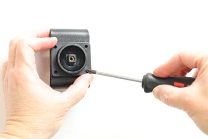 Place the holder over the attaching plate so the screw fits in the hole in the tilt swivel and screw it into place. Tighten the screw firm at first, then loosen it a bit so the holder is firmly in place, but still can be adjusted.