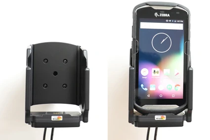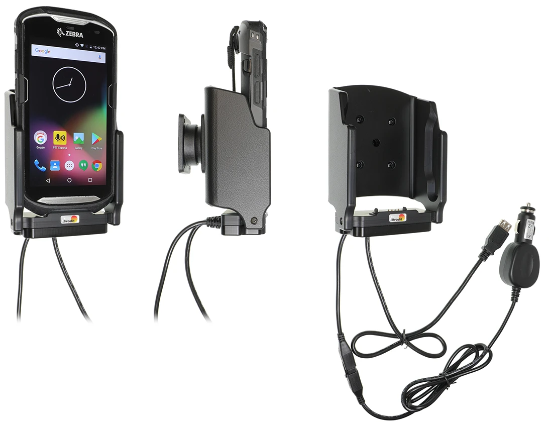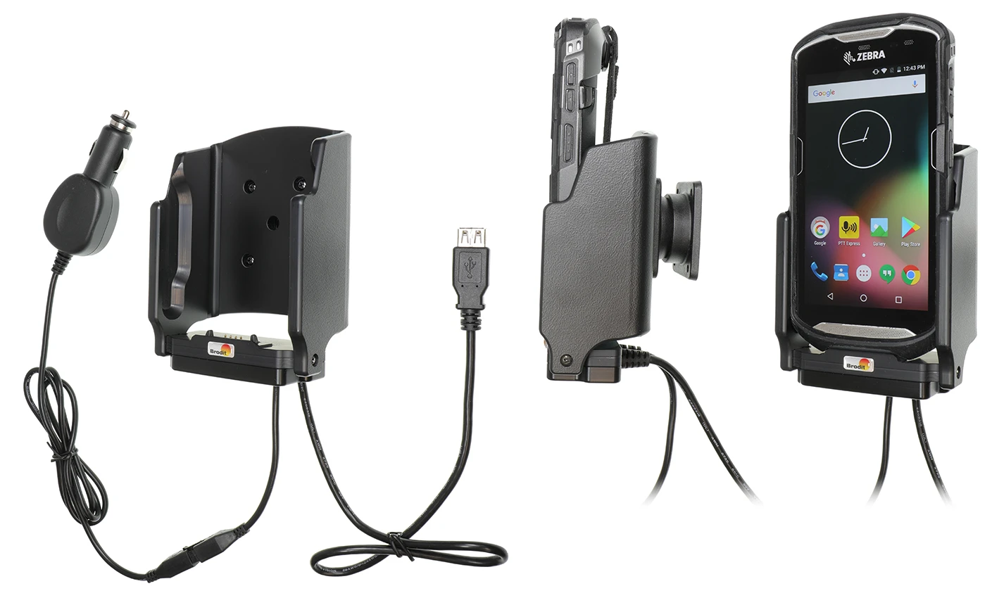 The active holder charges your battery when it is in the holder. The charging device connects to the PDA automatically when you put the PDA in the holder. The holder is attached onto a tilt swivel and can be adjusted in order to avoid light reflection. Active holder with USB Host, 3A charger, 12/24 Volt. With straight cable. Attach onto a ProClip Mounting Platform.