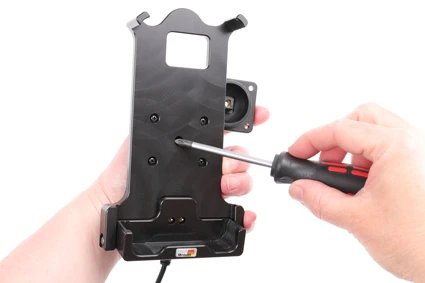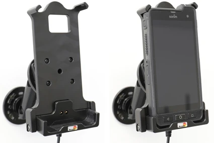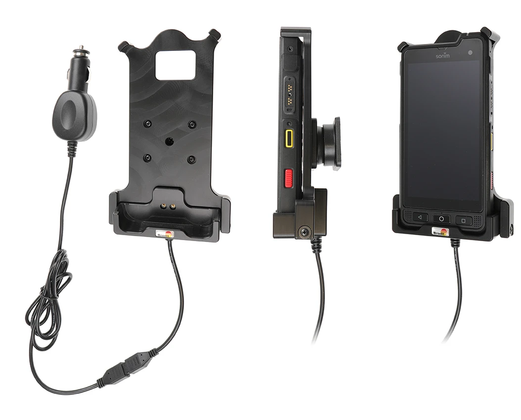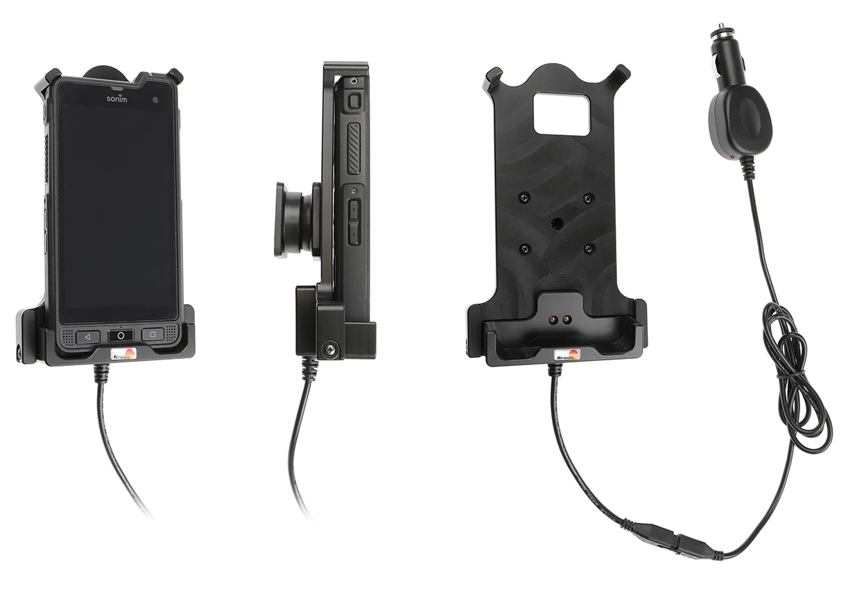 Extra robust holder, designed to withstand rough working conditions in everyday professional use. Customized holder with a very secure hold and unimpaired charging thanks to the 3-point hold feature. Soft connection to the charging pins which are hidden for protection from frequent wear and breakage. Easy insert/removal of the device in the holder. Discreet design. With cig-plug cable.