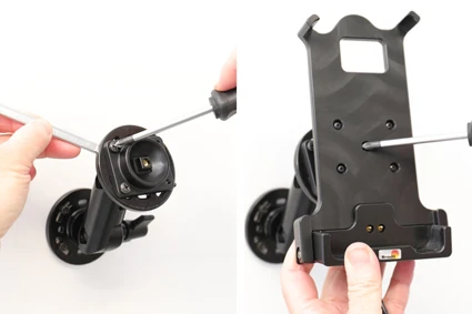 The holder is equipped with a tilt swivel so you can easily adjust the angle of your device for better viewing. Tilts 17° and swivels 360°. Made of high grade ABS/Acetal plastic. Mounting plate 42x50 mm with AMPS-holes. Color: black. Made in Sweden. Attach onto a Pedestal Mount.