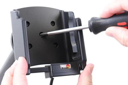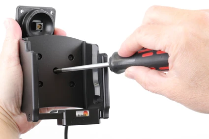 Place the holder over the attaching plate so the screw fits in the hole in the tilt swivel and screw it into place. Tighten the screw firm at first, then loosen it a bit so the holder is firmly in place, but still can be adjusted.