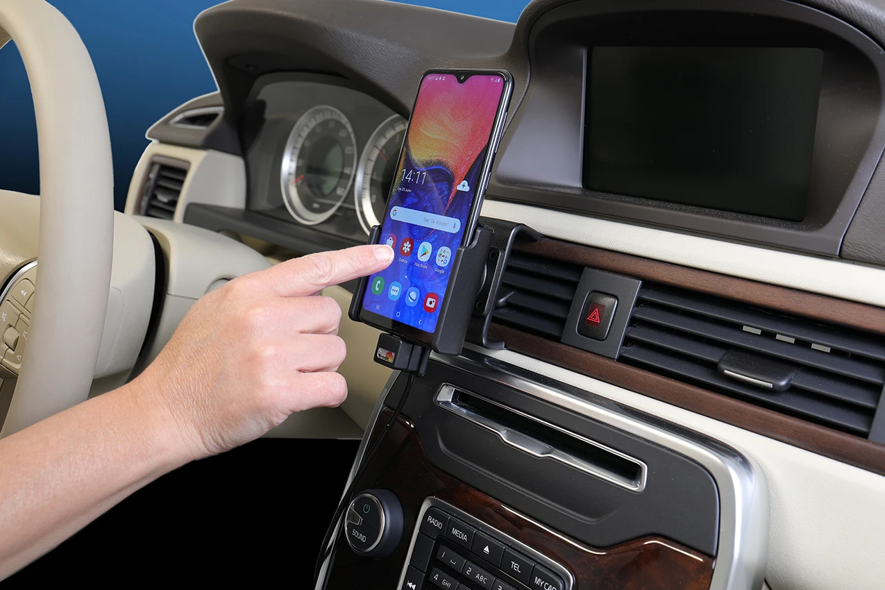 Keep your phone's battery fully charged in an active holder, always within easy sight and reach! Neat, discreet and convenient. Custom made with a perfect, firm fit. With cig-plug cable, 2A charging via the Micro-USB connector. You can charge a second device via the USB A outlet in the cig-plug, 1A charging. You have full access to the camera and all buttons when the device is in the holder. It is easy to slide the phone in place in the holder so it connects to the charging, and to take it out of the holder when leaving the vehicle.