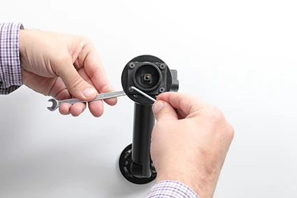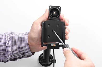 Place the holder over the attaching plate so the screw fits in the hole in the tilt swivel and screw it into place. Tighten the screw so the holder is firmly in place, but still can be adjusted.