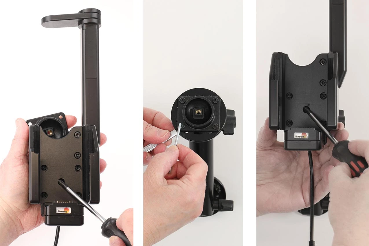The holder is equipped with a tilt swivel so you can easily adjust the angle for better viewing, or switch between portrait and landscape mode. Tilts 17° and swivels 360°. Mounting plate 42x50 mm with 4 mm AMPS-holes. Made of high grade black ABS/Acetal plastic. Color: black. Made in Sweden. Attach onto a Pedestal Mount.