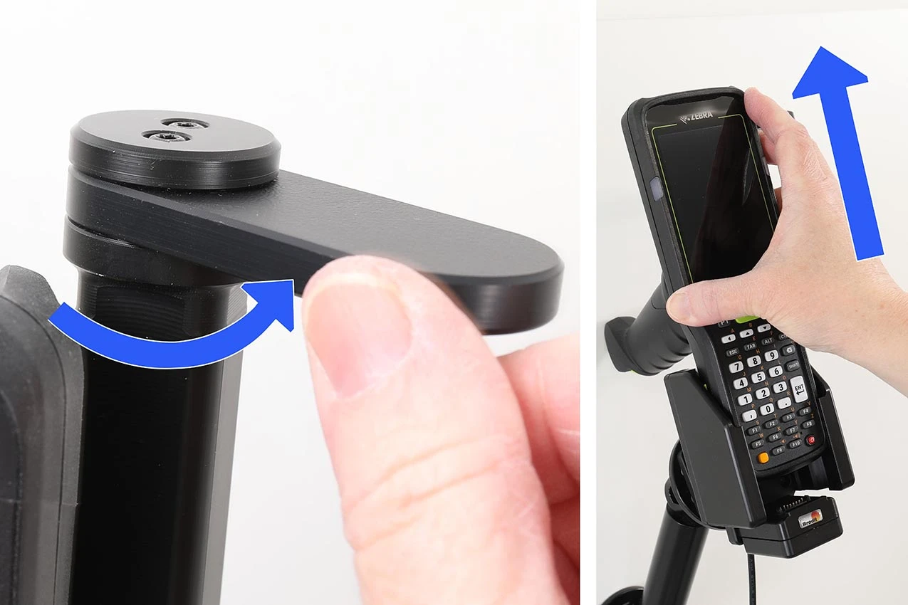 To remove the device from the holder: Turn the swiveling top sideways so the device is set free. Lift the device straight upward, out from the holder.