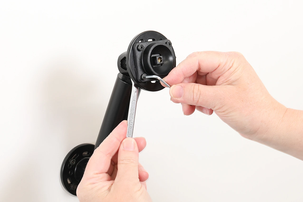 Place the holder over the attaching plate so the screw fits in the hole in the tilt swivel and screw it into place. Tighten the screw so the holder is firmly in place, but still can be adjusted.
