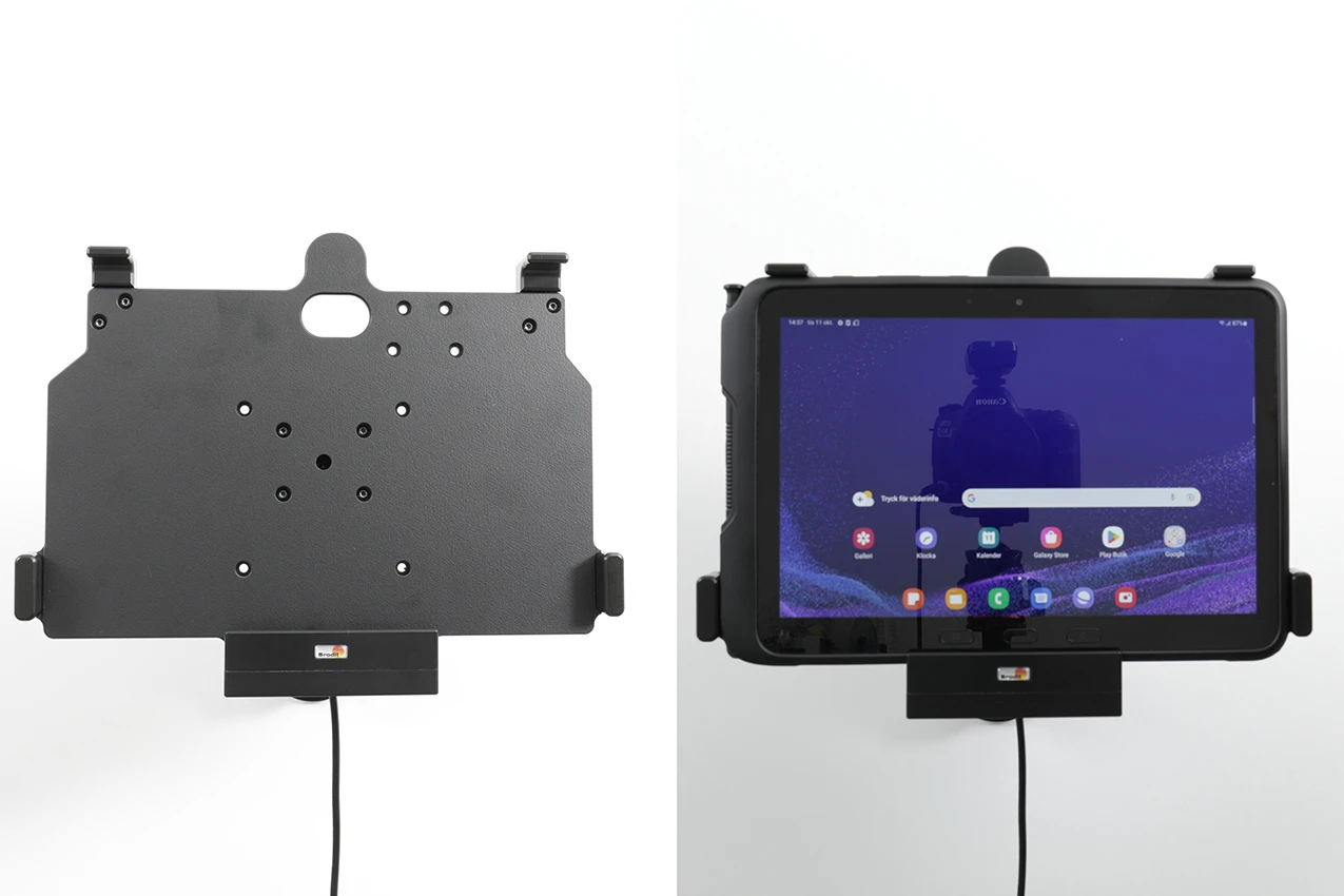 Use an active holder for your Galaxy Tab Active 5 Pro while driving and you will always have a freshly charged battery! The holder provides a neat and comfortable installation - safe and convenient. The holder is equipped with a cig-plug for connection to the vehicle's 12/24 Volt socket. 3A charging. Charging via pogo plug.