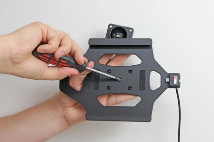 Place the holder over the attaching plate so the screw fits in the hole in the tilt swivel. Tighten the screw until the holder is firmly in place, but still can be adjusted.Slide the device sideways into the holder until you hear / feel it snaps into place.