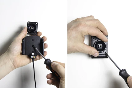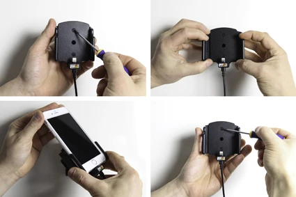 To adjust the holder for your device: Loosen the screws on the front side of the holder, so the sides of the holders can be adjusted. Place the device in the holder and press the sides together so the device is firmly in place. Tighten the screws on the front side of the holder.