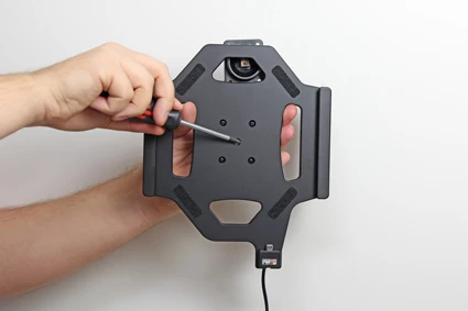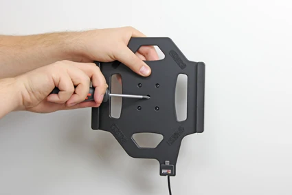 Place the holder over the attaching plate so the screw fits in the hole in the tilt swivel. Tighten the screw until the holder is firmly in place, but still can be adjusted.Slide the device sideways into the holder until you hear / feel it snaps into place.
