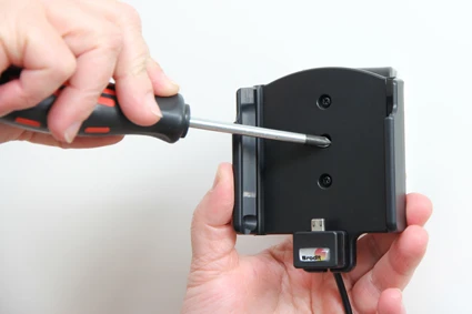 Place the holder over the attaching plate so the screw fits in the hole in the tilt swivel. Screw a few turns on the screw, just so the thread starts to pull. Pull the holder toward you and hold it slightly tensed, in the same time tighten the screw so the holder is pulled toward the tilt swivel. Tighten the screw until the holder is firmly in place, but still can be adjusted.