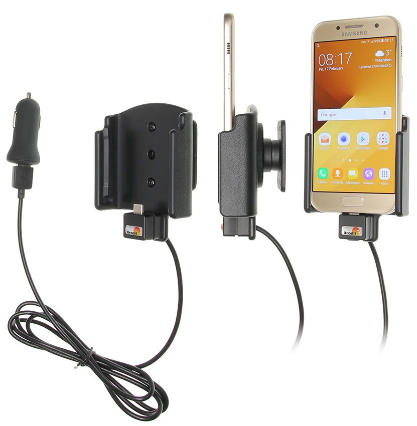 The active holder charges your Galaxy A3 (2017) when it is in the holder. You can choose to connect the cig-plug to the car's 12 Volt socket, or to remove the cig-plug adapter and connect the USB cable to the car's (or stereo's) USB connector.