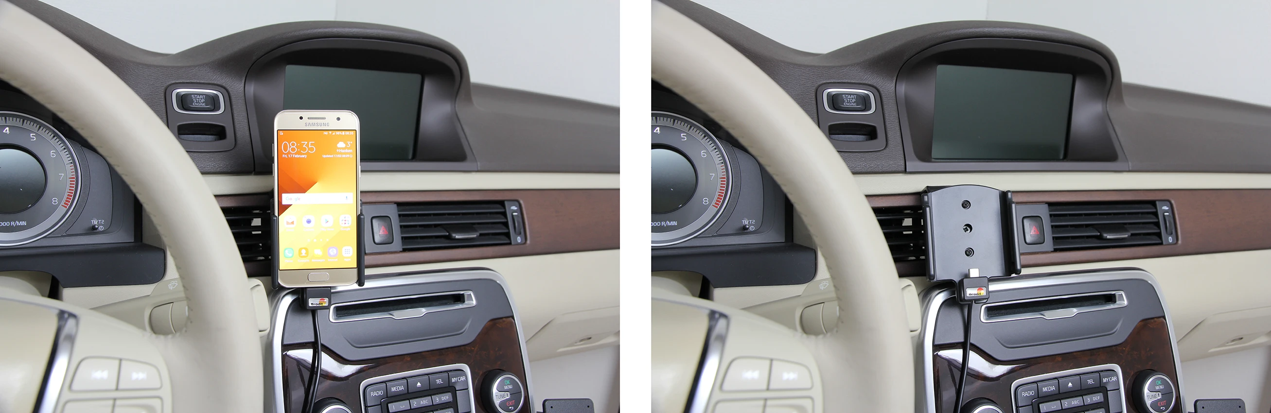 The holder is attached onto a tilt swivel and can be adjusted in order to avoid light reflection. 12 Volt. Attach the holder onto a ProClip Mounting Platform in your car.