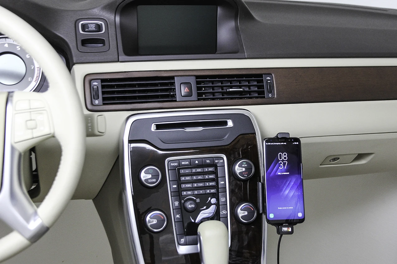 The holder is attached onto a tilt swivel and can be adjusted in order to avoid light reflection. Connects to the vehicle’s cigarette lighter socket, 12 Volt. Fits for devices with skin. The top part of the holder is adjustable and adapts to the height of your phone. Attach onto a ProClip Mounting Platform.