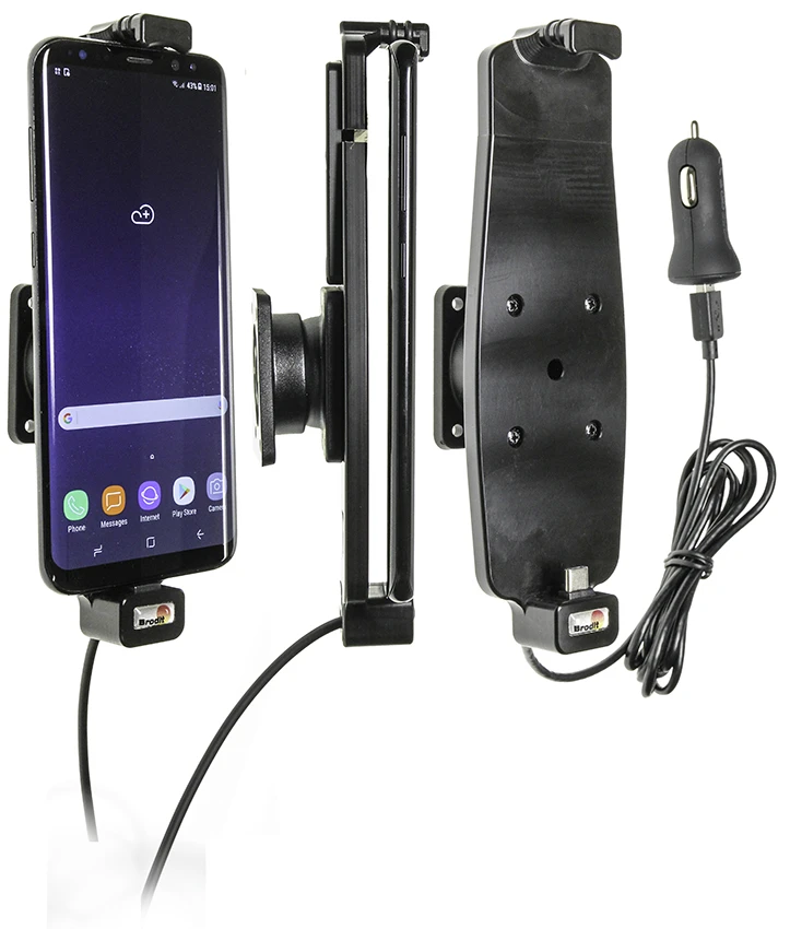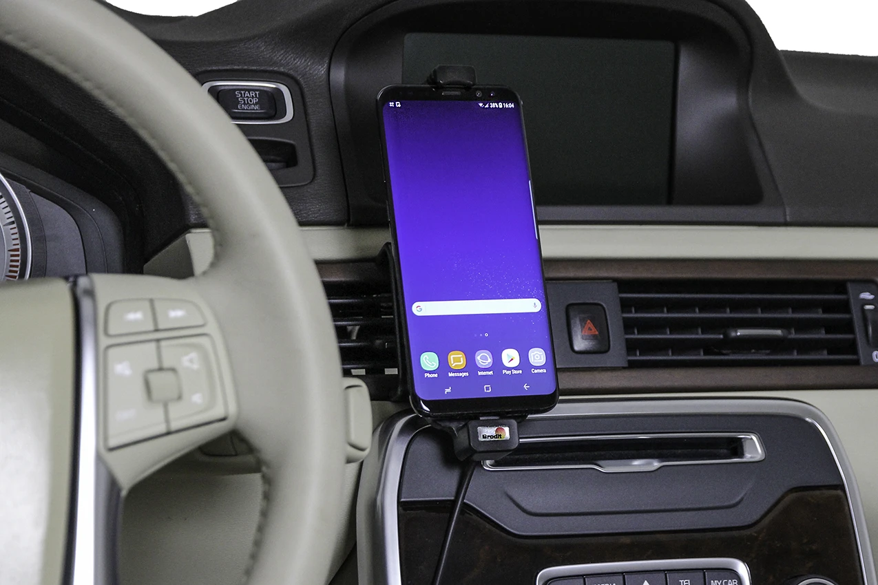The holder is attached onto a tilt swivel and can be adjusted in order to avoid light reflection. Connects to the vehicle’s cigarette lighter socket, 12 Volt. Fits for devices with skin. The top part of the holder is adjustable and adapts to the height of your phone. Attach onto a ProClip Mounting Platform.