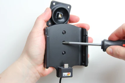 Place the holder over the attaching plate so the screw fits in the hole in the tilt swivel and screw it into place. Tighten the screw firm at first, then loosen it a bit so the holder is firmly in place, but still can be adjusted.