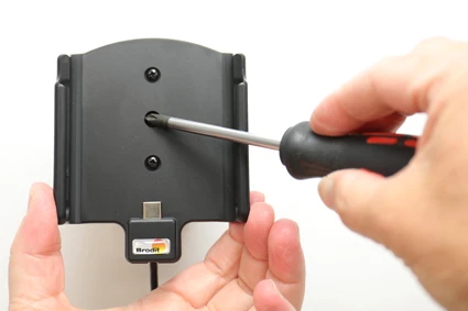 Place the holder over the attaching plate so the screw fits in the hole in the tilt swivel. Screw a few turns on the screw, just so the thread starts to pull. Pull the holder toward you and hold it slightly tensed, in the same time tighten the screw so the holder is pulled toward the tilt swivel. Tighten the screw until the holder is firmly in place, but still can be adjusted.