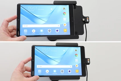 The choice for a freshly charged battery, a neat and comfortable installation. The holder is equipped with an approved cig-plug cable for connection to the vehicle's 12 Volt socket. When you place the MediaPad in the holder, it automatically connects to the charging unit. If you have a car with USB interface, you can disconnect the cig-plug from the holder's cable in order to get a USB-cable to connect directly to the USB connector in your vehicle. The holder is mounted onto a tilt swivel so you can adjust the angle and switch between portrait and landscape mode.