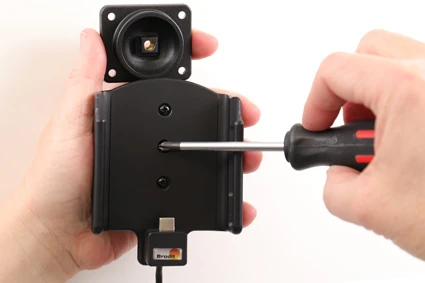 Place the holder over the attaching plate so the screw fits in the hole in the tilt swivel and screw it into place. Tighten the screw firm at first, then loosen it a bit so the holder is firmly in place, but still can be adjusted.