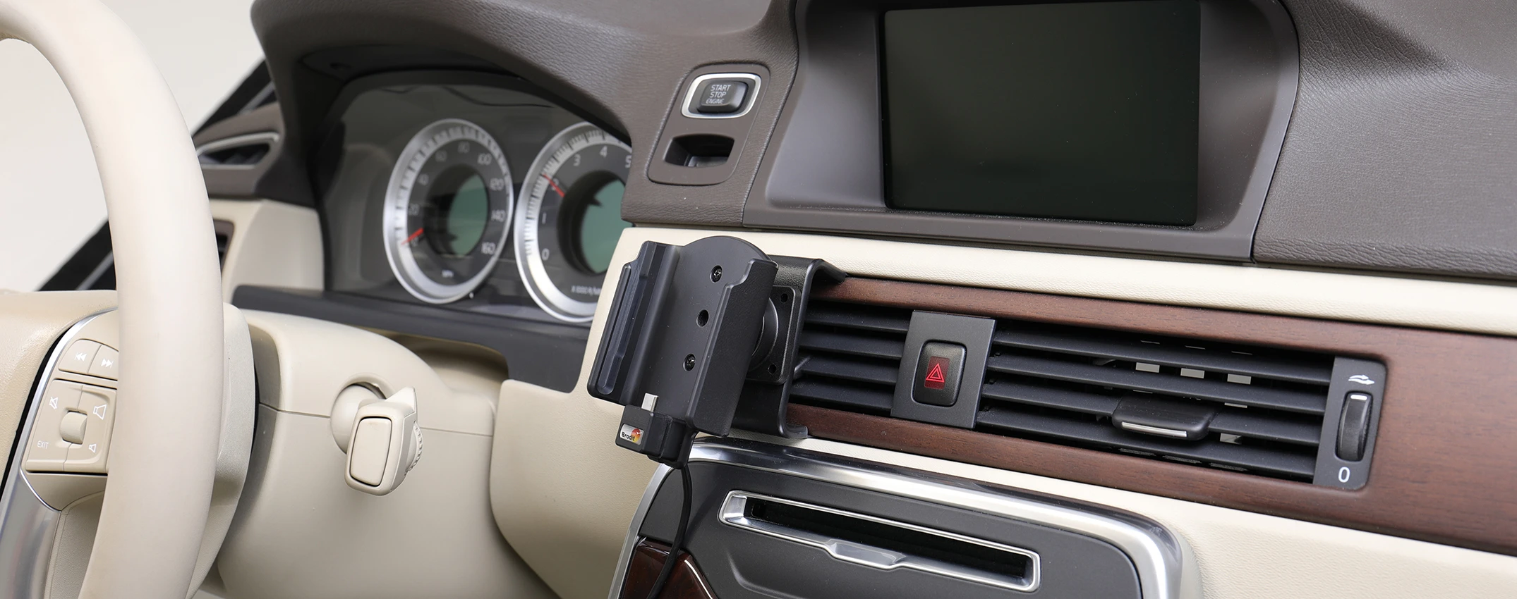 Keep your phone's battery fully charged in an active holder, always within easy sight and reach! Neat, discreet and convenient. Custom made with a perfect, firm fit. With USB-cable with cig-plug adapter, choose to connect either to the vehicle's USB outlet or the 12/24V socket.You have full access to the camera and all buttons when the device is in the holder. It is easy to slide the device into place in the holder so it connects to the charging, and to take it out of the holder when leaving the car.