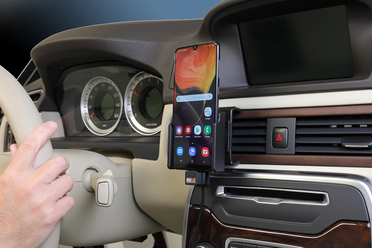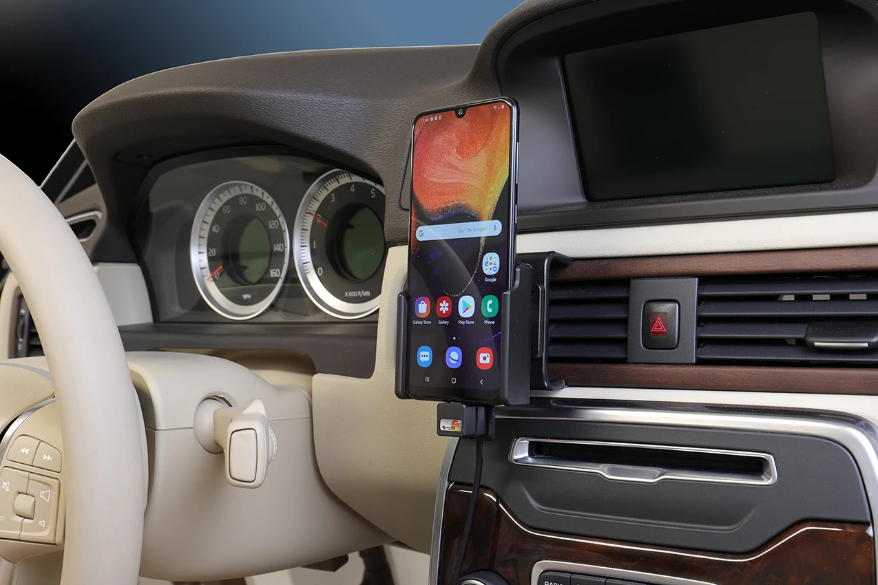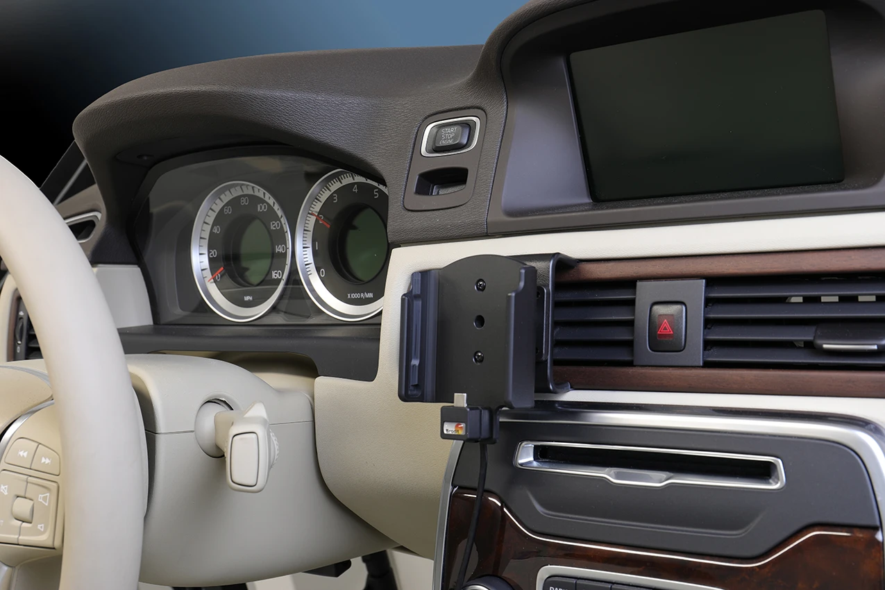 Keep your phone's battery fully charged in an active holder, always within easy sight and reach! Neat, discreet and convenient. Custom made with a perfect, firm fit. With USB-cable with cig-plug adapter, choose to connect either to the vehicle's USB outlet or the 12/24V socket.You have full access to the camera and all buttons when the device is in the holder. It is easy to slide the device into place in the holder so it connects to the charging, and to take it out of the holder when leaving the car.