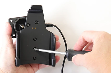 To place the device in the holder: Place the bottom part of the device into the holder. Press the top of the device forward into place in the holder. To remove the device from the holder: Press the upper part of the holder forward/upward. Pull/flip the upper part of the device our of the holder. Lift the device out from the holder.