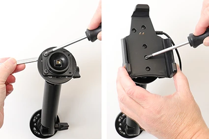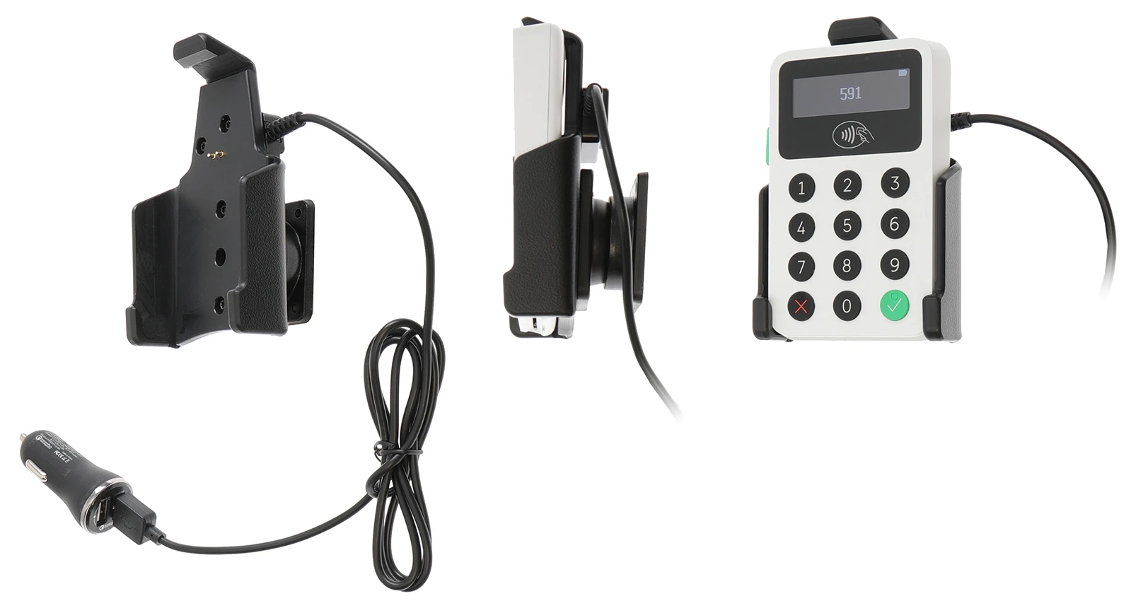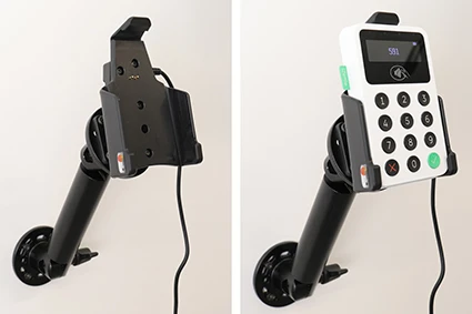 With your payment terminal in an active holder, you will always have a fully charged battery. The charging device connects to the payment terminal automatically when you put the device in the holder. The holder is attached onto a tilt swivel and can be adjusted in order to avoid light reflection. Connects to the vehicle’s cigarette lighter socket or USB socket, 12/24 Volt.