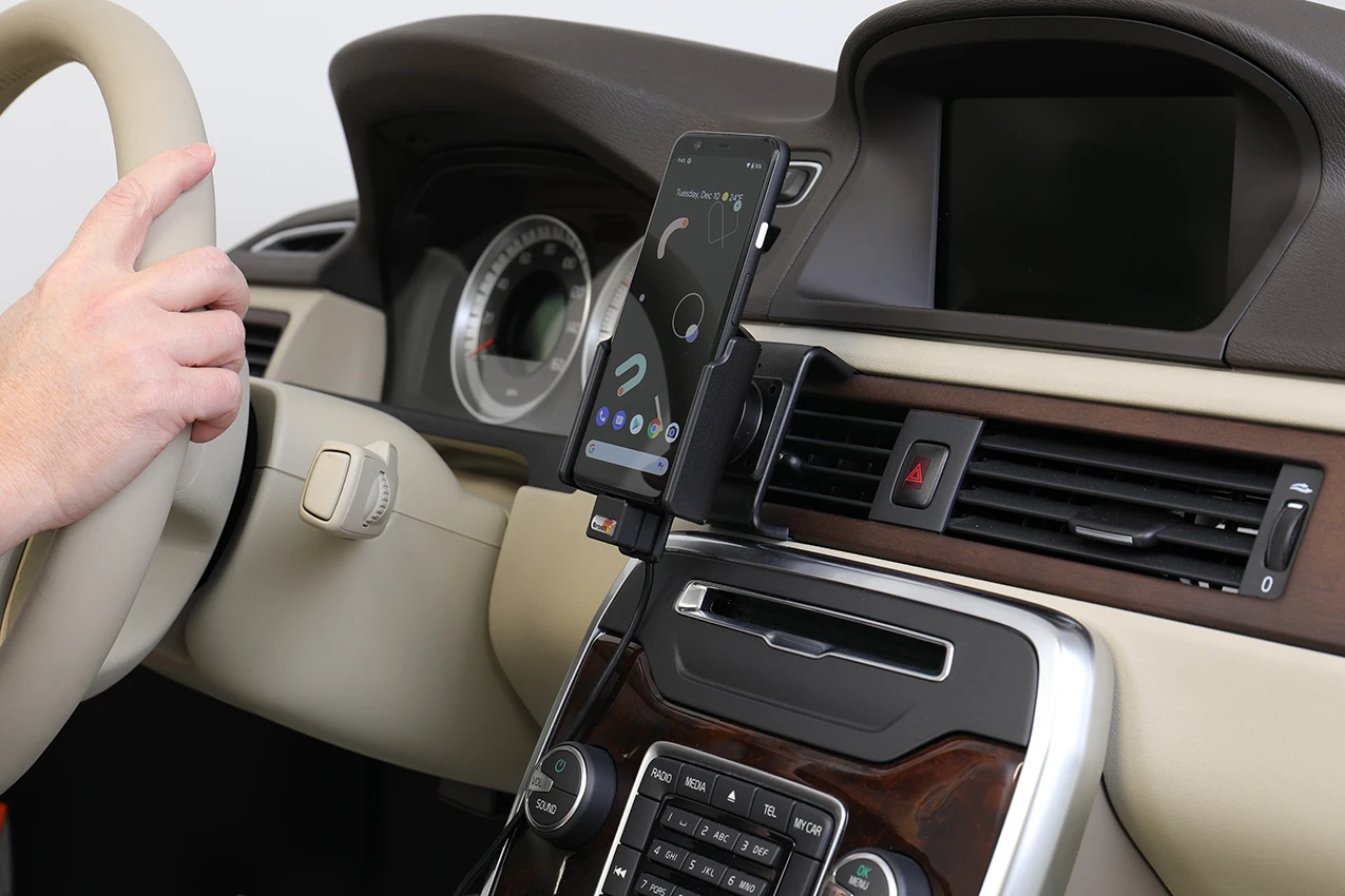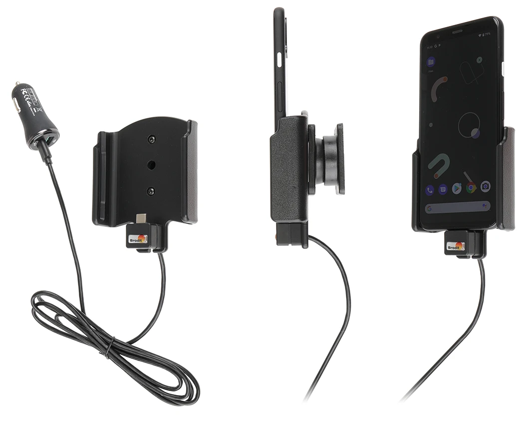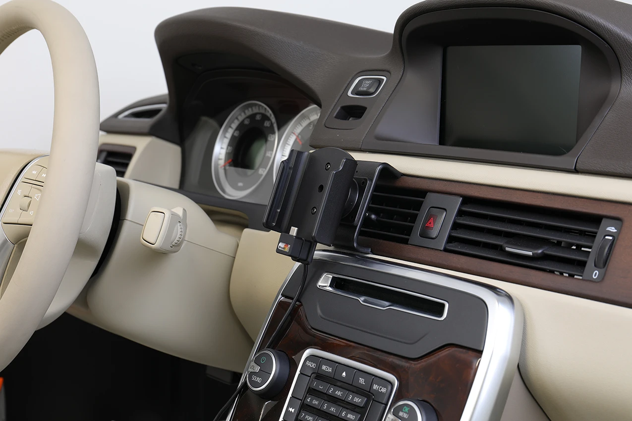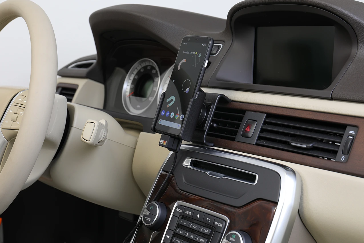 Keep your phone's battery fully charged in an active holder, always within easy sight and reach! Neat, discreet and convenient. Custom made with a perfect, firm fit. With USB-cable with cig-plug adapter, choose to connect either to the vehicle's USB outlet or the 12/24V socket.The cig-plug adapter has two USB ports: Type-A and Type-C. You have full access to the camera and all buttons when the device is in the holder. It is easy to slide the device into place in the holder so it connects to the charging, and to take it out of the holder when leaving the car.