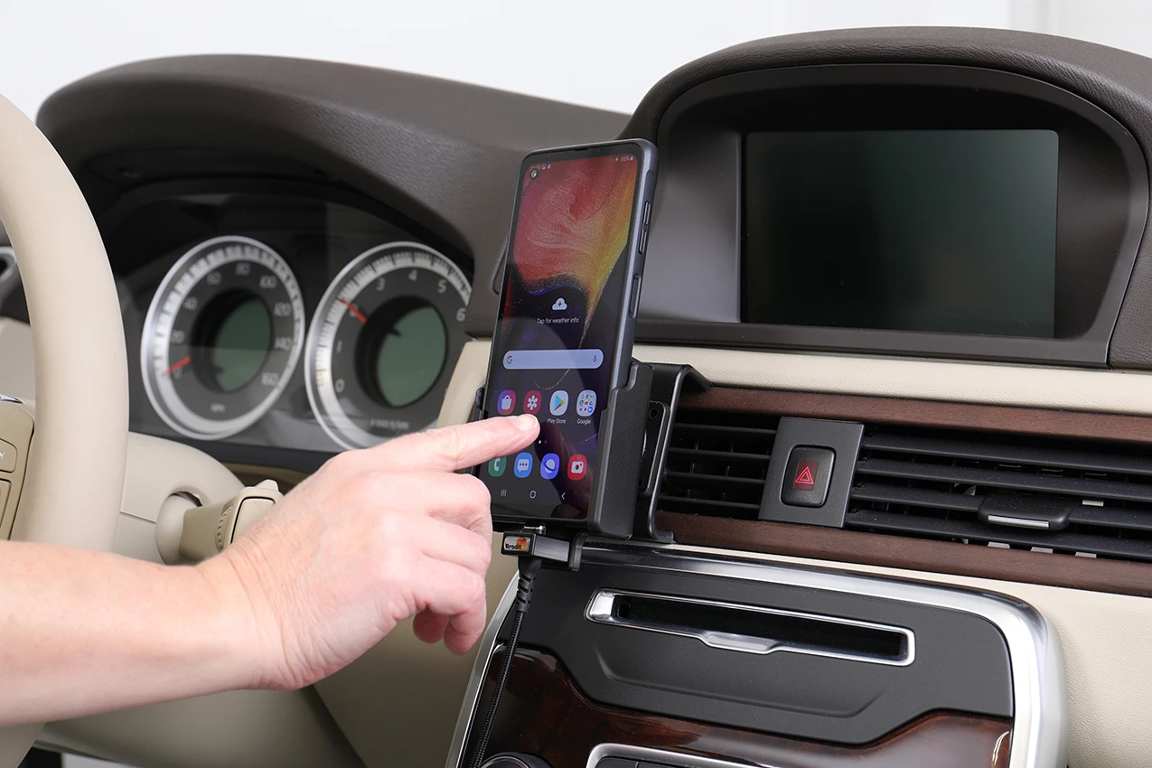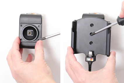 The holder is equipped with a tilt swivel so you can easily adjust the angle for better viewing, or switch between portrait and landscape mode. Tilts 17° and swivels 360°. Mounting plate 42x50 mm with 4 mm AMPS-holes. Made of high grade ABS/Acetal plastic. Color: black. Made in Sweden. Attach onto a ProClip Mounting Platform or a Pedestal Mount.