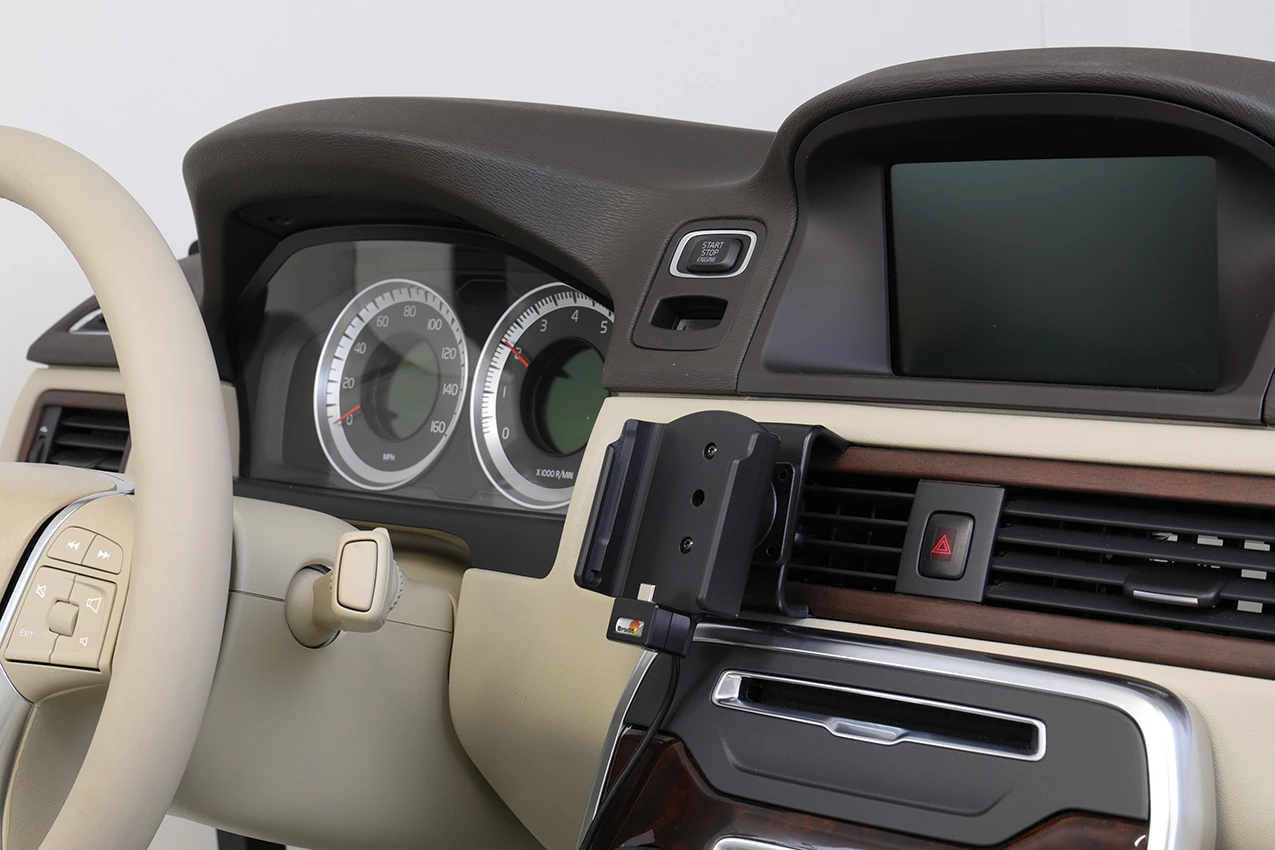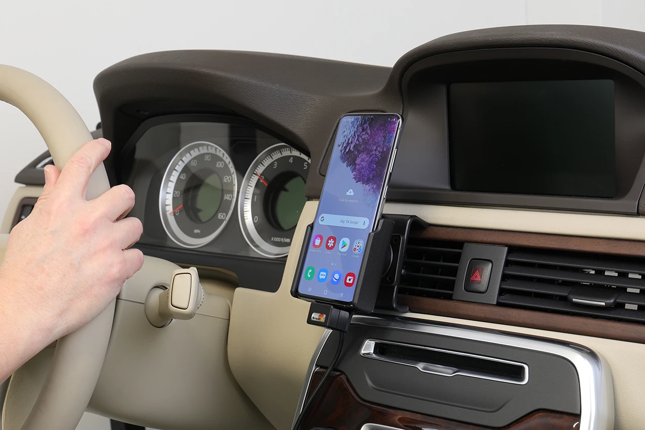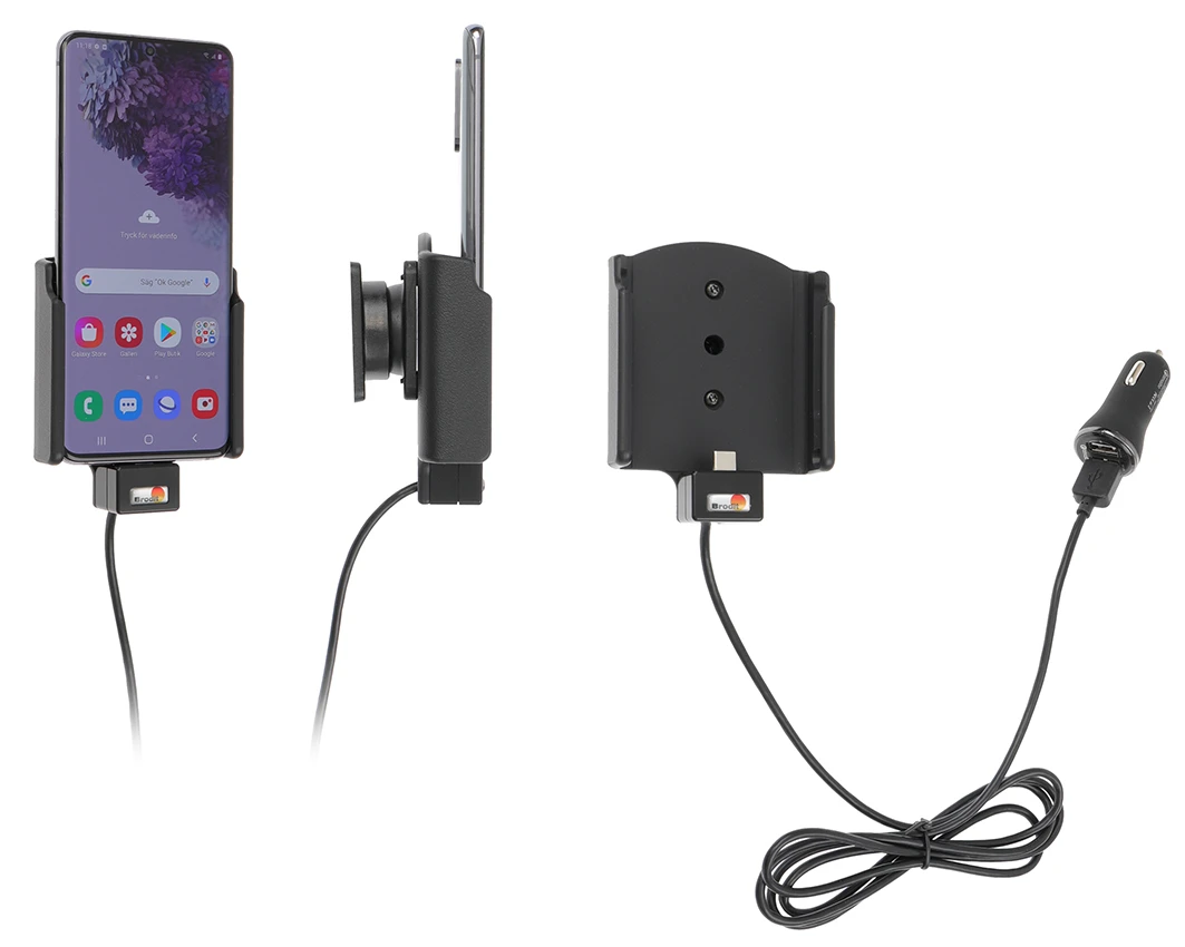 Keep your phone's battery fully charged in an active holder, always within easy sight and reach! Neat, discreet and convenient. Custom made with a perfect, firm fit. With USB-cable with cig-plug adapter, choose to connect either to the vehicle's USB outlet or the 12/24V socket.The cig-plug adapter has two USB ports: QC 3.0A + 2.4A. You have full access to the camera and all buttons when the device is in the holder. It is easy to slide the device into place in the holder so it connects to the charging, and to take it out of the holder when leaving the car.