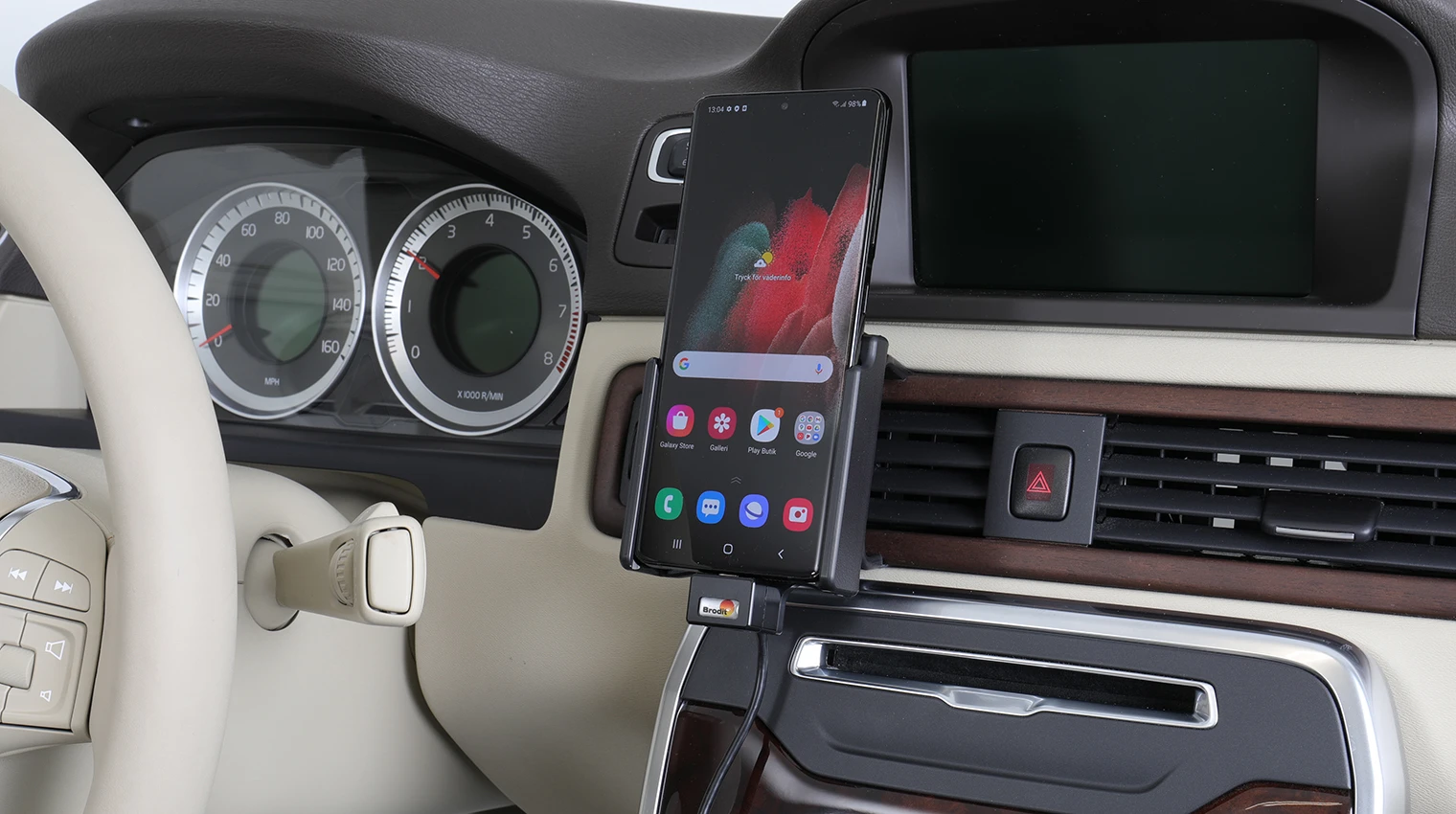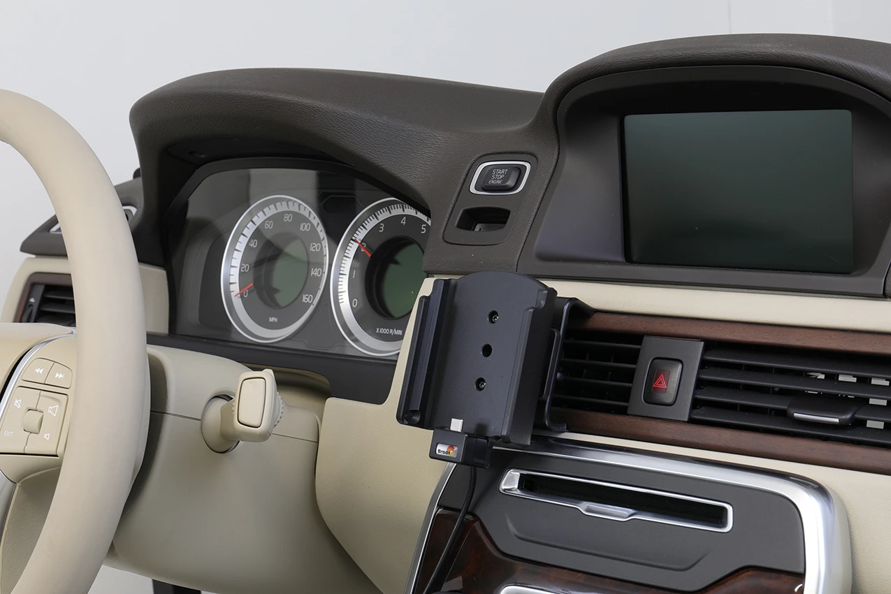 Keep your phone's battery fully charged in an active holder, always within easy sight and reach! Neat, discreet and convenient. Custom made with a perfect, firm fit. With USB-A cable with cig-plug adapter, choose to connect either to the vehicle's USB-A outlet or the 12/24V socket.The cig-plug adapter has two USB-A ports: QC 3.0A + 2.4A. You have full access to the camera and all buttons when the device is in the holder. It is easy to slide the device into place in the holder so it connects to the charging, and to take it out of the holder when leaving the car.