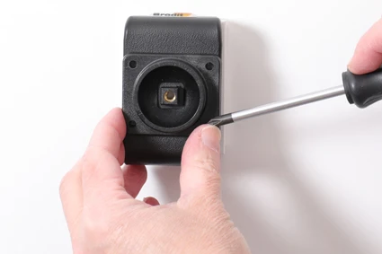 Place the holder over the attaching plate so the screw fits in the hole in the tilt swivel and screw it into place. Tighten the screw so the holder is firmly in place, but still can be adjusted.