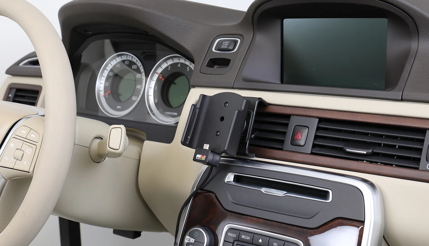 Keep your phone's battery fully charged in an active holder, always within easy sight and reach! Neat, discreet and convenient. Custom made with a perfect, firm fit. With USB-cable with cig-plug adapter, choose to connect either to the vehicle's USB outlet or the 12/24V socket.The cig-plug adapter has two USB ports: QC 3.0A + 2.4A. You have full access to the camera and all buttons when the device is in the holder. It is easy to slide the device into place in the holder so it connects to the charging, and to take it out of the holder when leaving the car.