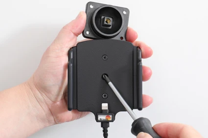 To adjust the holder for your device: Loosen the screws on the front side of the holder, so the sides of the holders can be adjusted. Place the device in the holder and press the sides together so the device is firmly in place. Remove the device carefully without moving the sides. Tighten the screws on the front side of the holder.