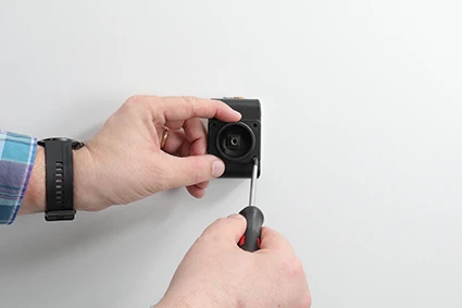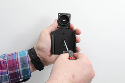 Place the holder over the attaching plate so the screw fits in the hole in the tilt swivel and screw it into place. Tighten the screw so the holder is firmly in place, but still can be adjusted.