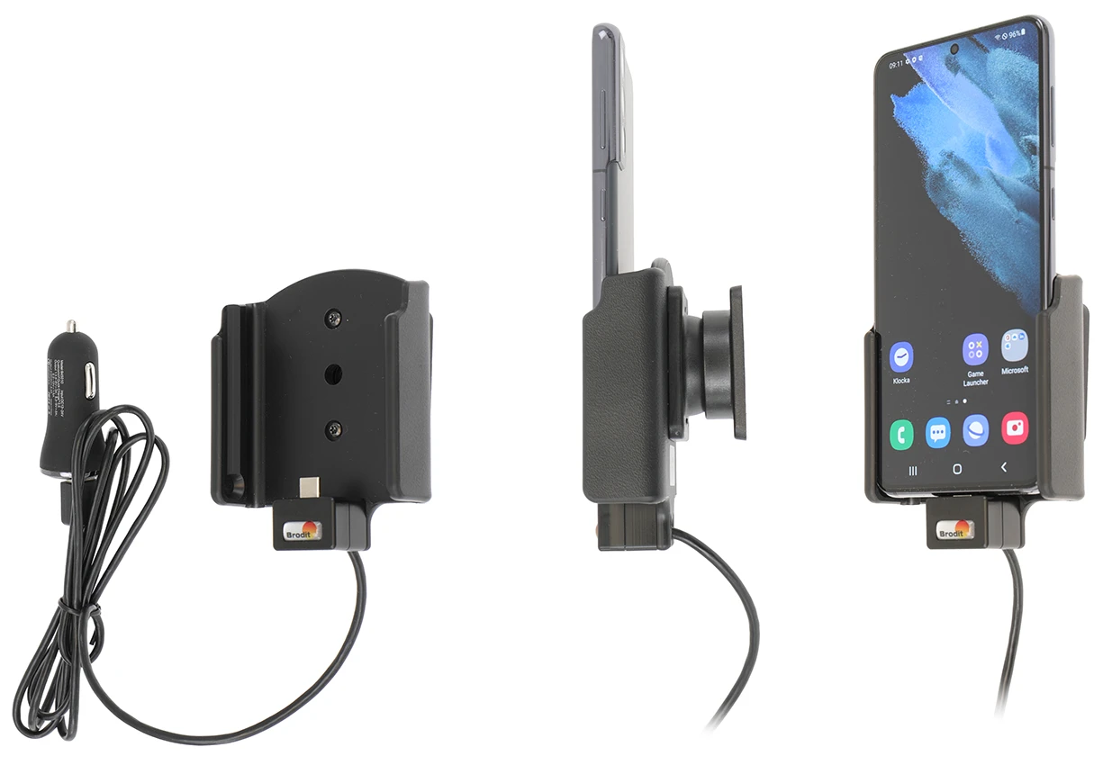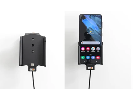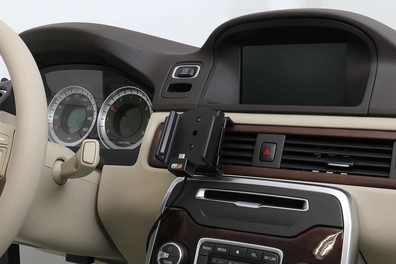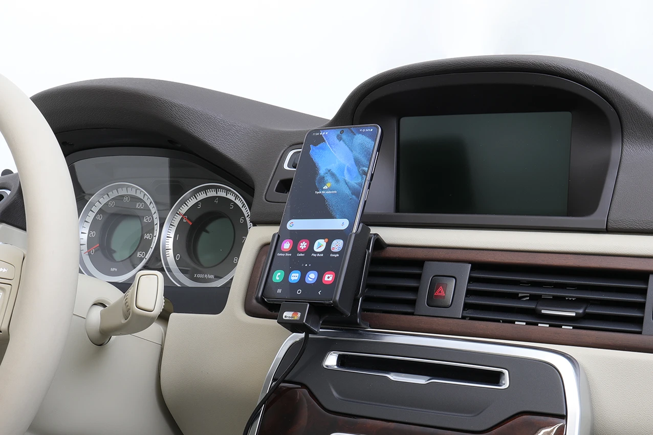 Keep your phone's battery fully charged in an active holder, always within easy sight and reach! Neat, discreet and convenient. Custom made with a perfect, firm fit. With USB-A cable with cig-plug adapter, choose to connect either to the vehicle's USB-A outlet or the 12/24V socket.The cig-plug adapter has two USB-A ports: QC 3.0A + 2.4A. You have full access to the camera and all buttons when the device is in the holder. It is easy to slide the device into place in the holder so it connects to the charging, and to take it out of the holder when leaving the car.