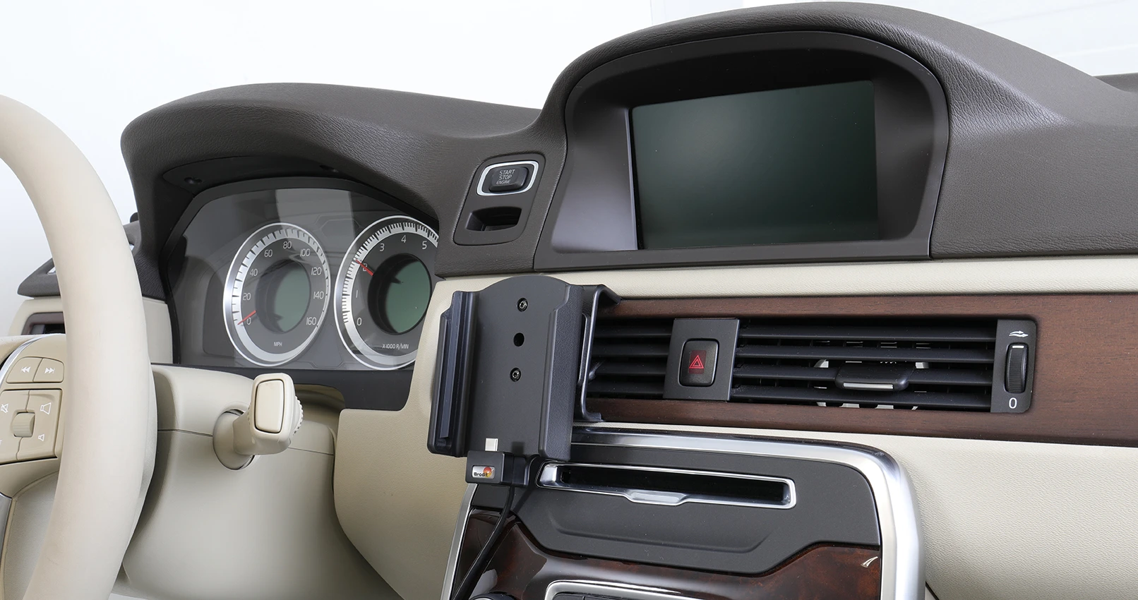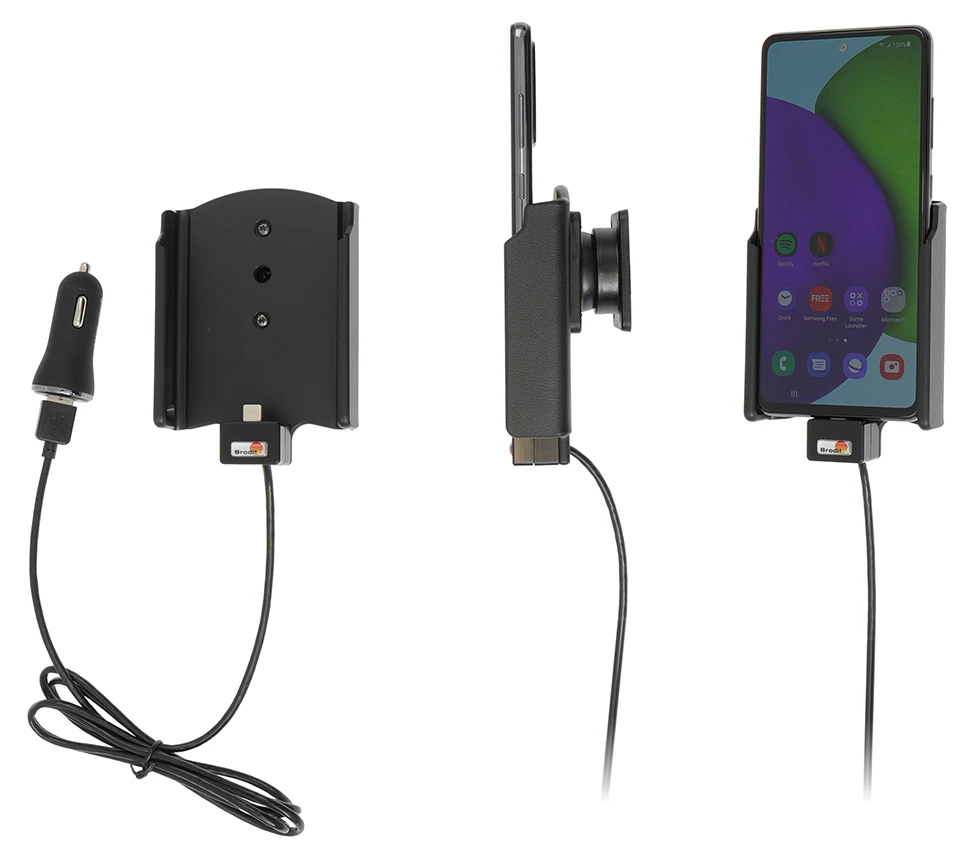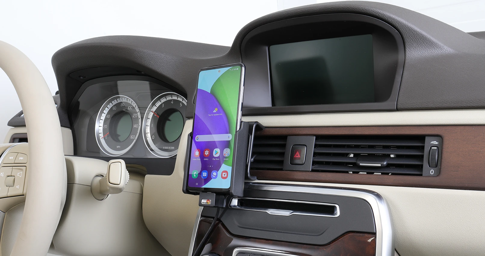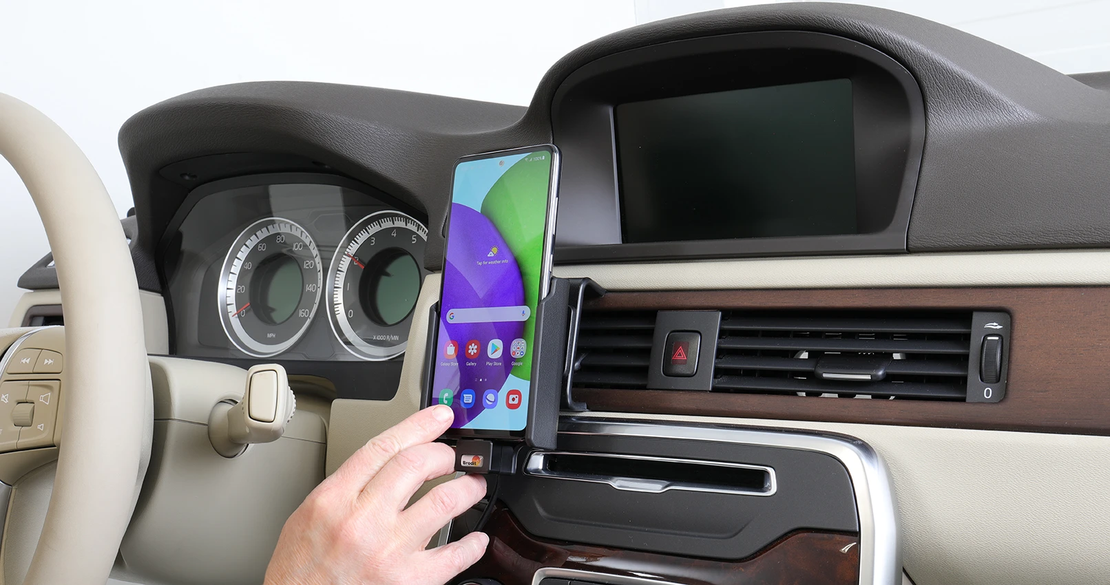 Keep your phone's battery fully charged in an active holder, always within easy sight and reach! Neat, discreet and convenient. Custom made with a perfect, firm fit. With USB-A cable with cig-plug adapter, choose to connect either to the vehicle's USB-A outlet or the 12/24V socket.The cig-plug adapter has two USB-A ports: QC 3.0A + 2.4A. You have full access to the camera and all buttons when the device is in the holder. It is easy to slide the device into place in the holder so it connects to the charging, and to take it out of the holder when leaving the car.