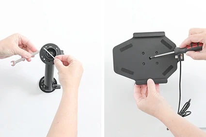 Place the attaching plate onto the desired position. Screw the attaching plate into place with the enclosed screws. Place the holder over the attaching plate so the screw fits in the hole in the tilt swivel. Tighten the screw until the holder is firmly in place, but still can be adjusted.