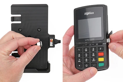 To place the device in the holder: Slide the device sideways into the holder so the magnetic tip connects. To remove the device from the holder: Slide the device sideways and out from the holder.