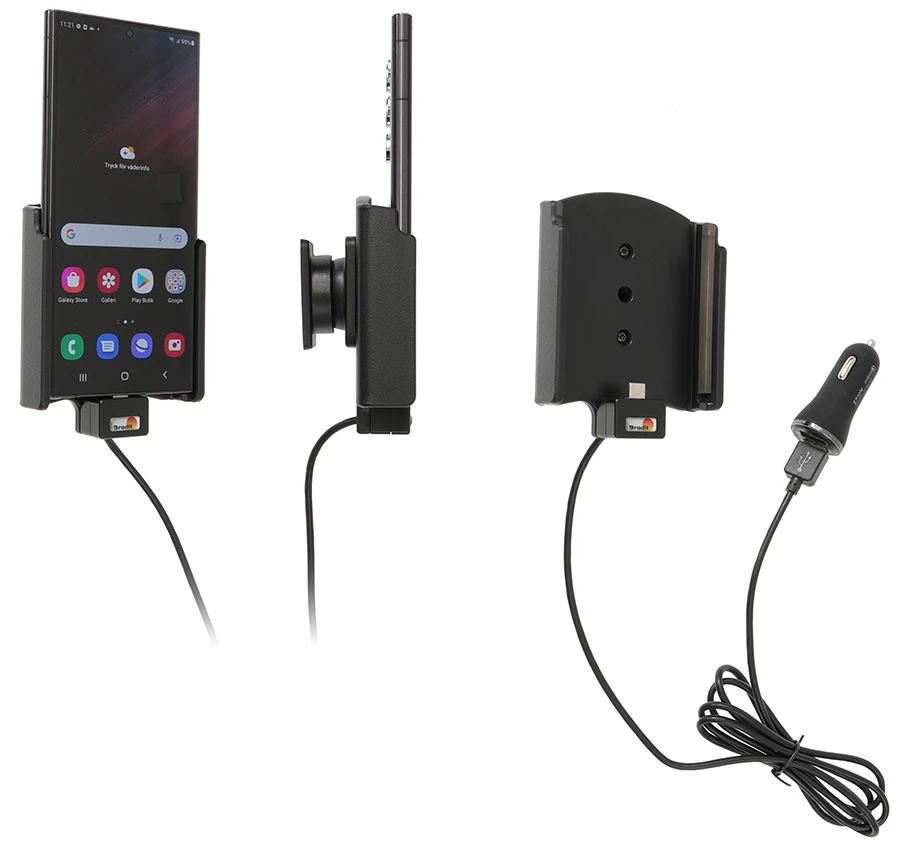 Keep your phone's battery fully charged in an active holder, always within easy sight and reach! Neat, discreet and convenient. Custom made with a perfect, firm fit. With USB-A cable with cig-plug adapter, choose to connect either to the vehicle's USB-A outlet or the 12/24V socket.The cig-plug adapter has two USB-A ports: QC 3.0A + 2.4A. You have full access to the camera and all buttons when the device is in the holder. It is easy to slide the device into place in the holder so it connects to the charging, and to take it out of the holder when leaving the car.