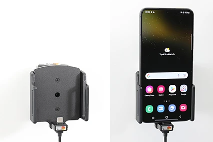 The adjustable holder fits for devices with USB type C connector, with skin, with the following dimensions: Width: 75-89 mm, Thickness: 6-10 mm. Measure your device and compare with the holder specifications in order to make sure you have chosen the correct product. Before using the holder you need to set the holder's width so it suits your device, then your phone is held firmly in place in an upright position for maximum cellular reception. The holder has a neat and discreet design which blends well with the vehicle's interior.