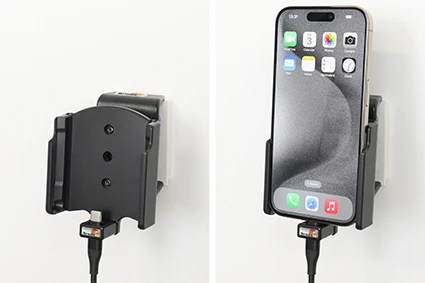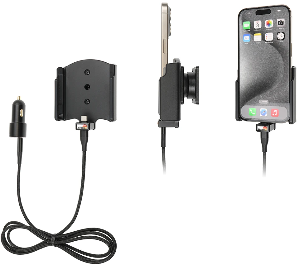 Keep your phone's battery fully charged in an active holder, always within easy sight and reach! Neat, discreet and convenient. Custom made with a perfect, firm fit. With USB-cable with cig-plug adapter, choose to connect either to the vehicle's USB outlet or the 12/24V socket.The cig-plug adapter has two USB ports: Type-A and Type-C. You have full access to the camera and all buttons when the device is in the holder. It is easy to slide the device into place in the holder so it connects to the charging, and to take it out of the holder when leaving the car.