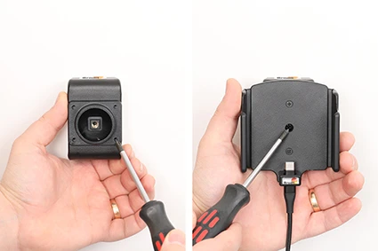To adjust the holder for your device: Loosen the screws on the front side of the holder, so the sides of the holders can be adjusted. Place the device in the holder and press the sides together so the device is firmly in place. Remove the device carefully without moving the sides. Tighten the screws on the front side of the holder.